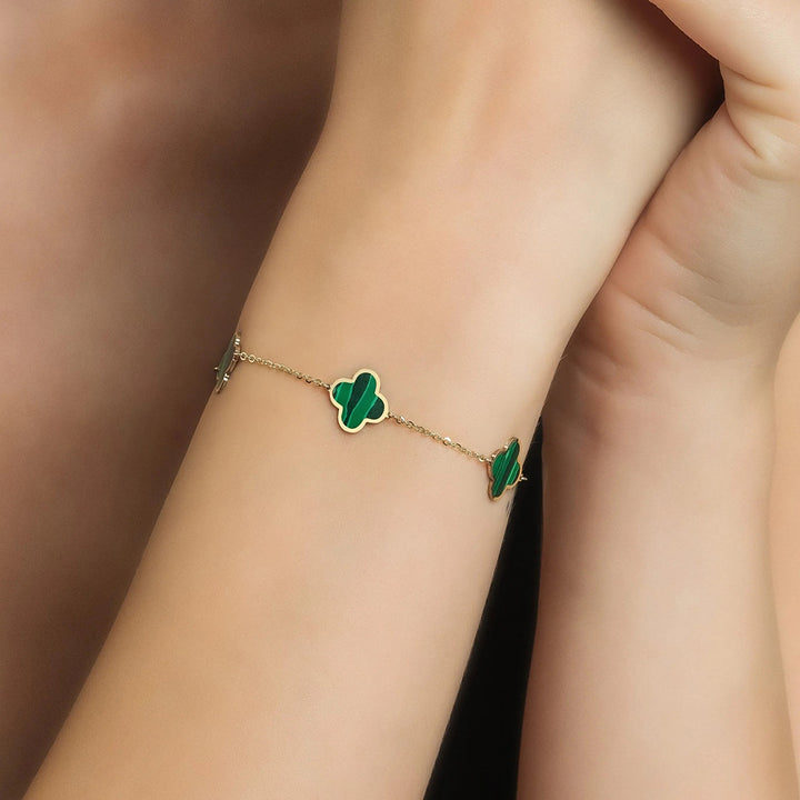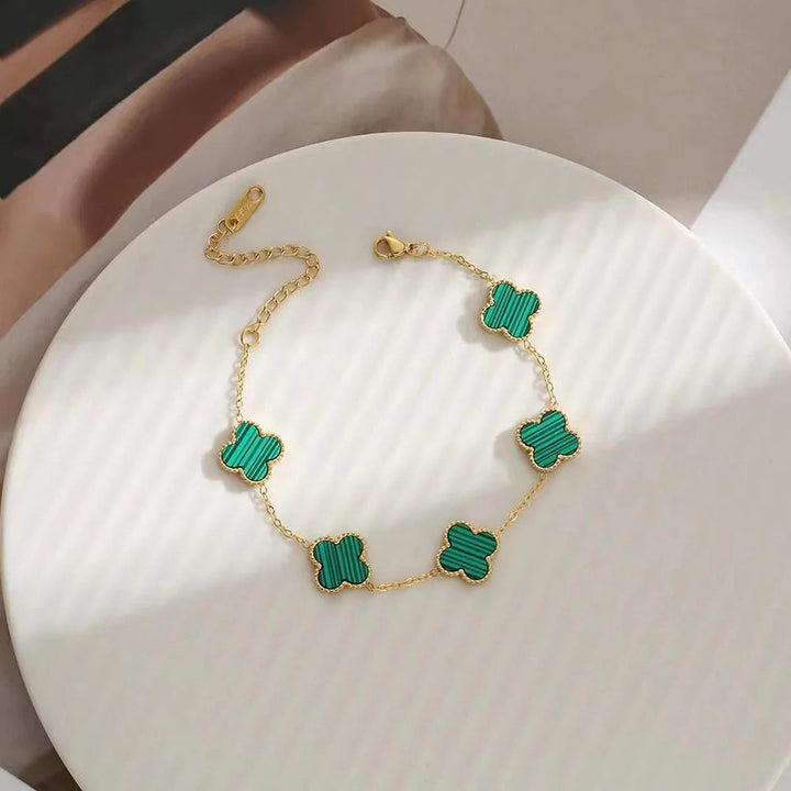 This stylish Green Clover Bracelet is crafted with a timeless elegance. Wear it as a classic accessory for any outfit or occasion. The sleek golden finish will add a subtle yet powerful look to your style.