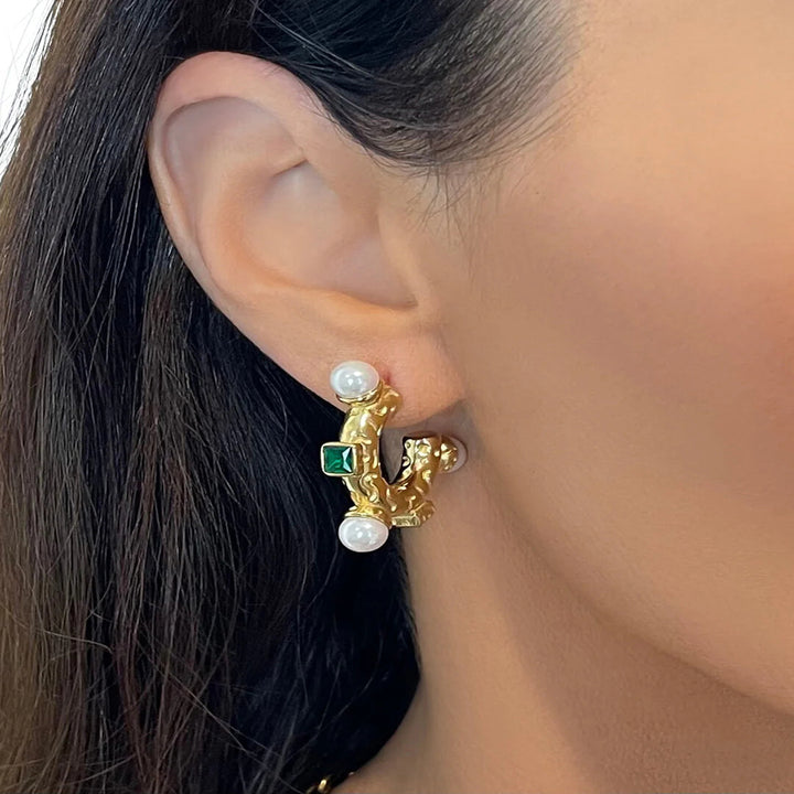 Introducing our exquisite pair of earrings adorned with stunning green stones and delicate pearls. These earrings are the perfect accessory to add a touch of elegance and sophistication to any outfit. Crafted with meticulous attention to detail, the combination of the vibrant green stones and lustrous pearls creates a captivating and timeless design. Whether you're attending a formal event or simply want to elevate your everyday look, these earrings are a must-have addition to your jewelry collection.