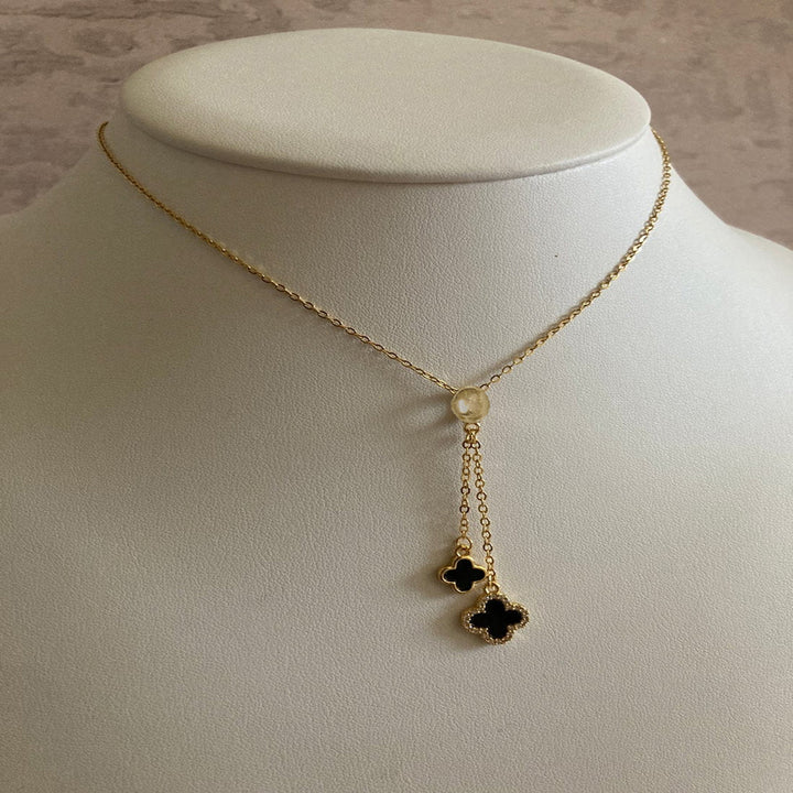 This delicate Y Clover Necklace features a Y-shaped design. A small, textured gold bead sits at the top of the "Y," from which two delicate chains descend. One chain holds a larger black clover with a gold outline, while the other holds a slightly smaller black clover outlined with sparkling clear stones.